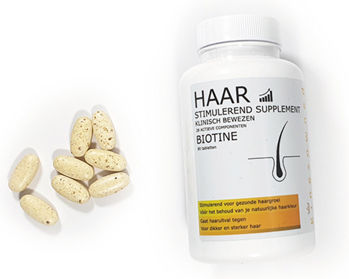 Onze haargroeiproducten bevatten vitamine B12 (106,8%) en biotine om je haar en hoofdhuid te ondersteunen. De vitamine B12 helpt bij het behoud van een gezonde huid en haar. Biotine, ook wel vitamine B7 genoemd, is een essentiële voedingsstof die helpt bij het behoud van gezond haar en hoofdhuid. Ons supplement bevat ook andere vitaminen en mineralen die je lichaam nodig heeft om gezond en sterk haar te krijgen. Onze haargroeiproducten zijn geschikt voor zowel mannen als vrouwen. Het is verkrijgbaar in de vorm van 90 tabletten, die gemakkelijk te slikken zijn. Het is een 100% natuurlijk product dat je kan helpen met je haaruitval. Dit product wordt aanbevolen voor mensen die last hebben van haaruitval, dun of breekbaar haar. Probeer onze haargroeiproducten om je haar te helpen gezond en sterk te maken.